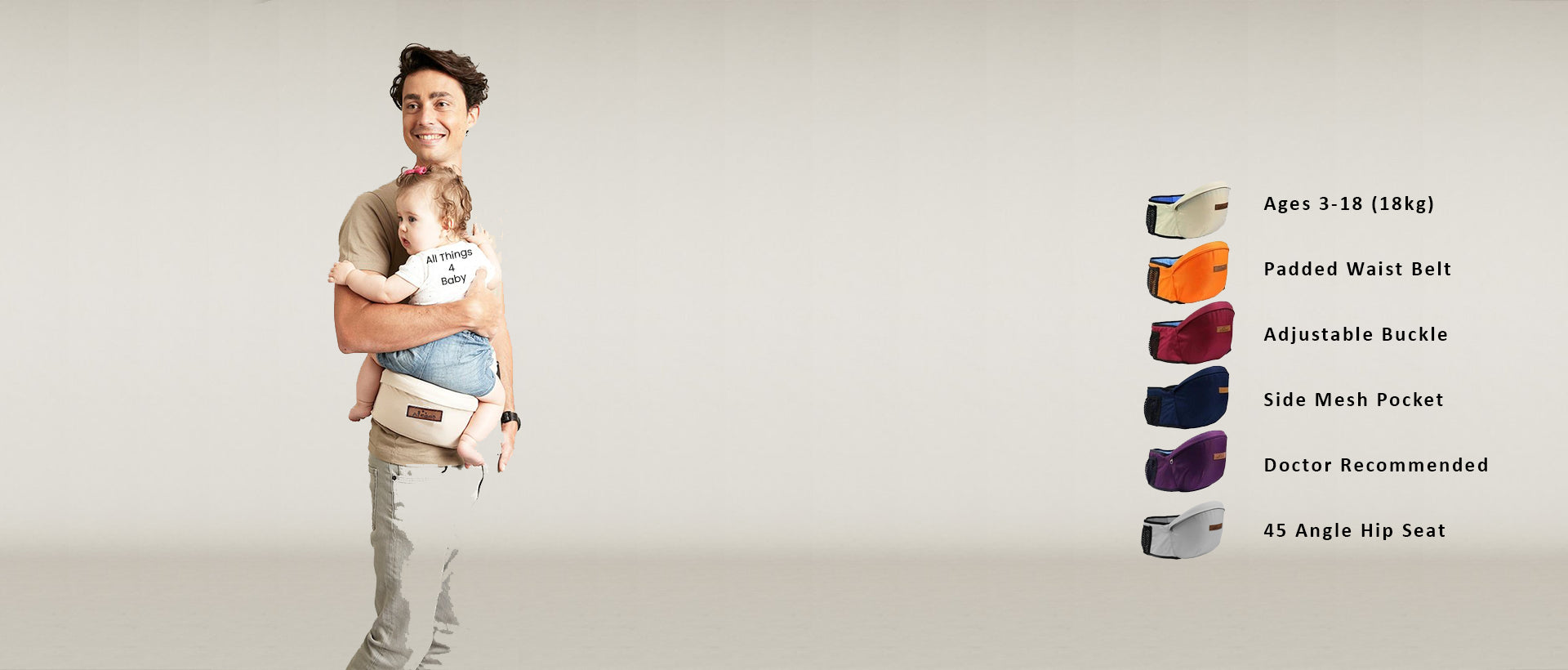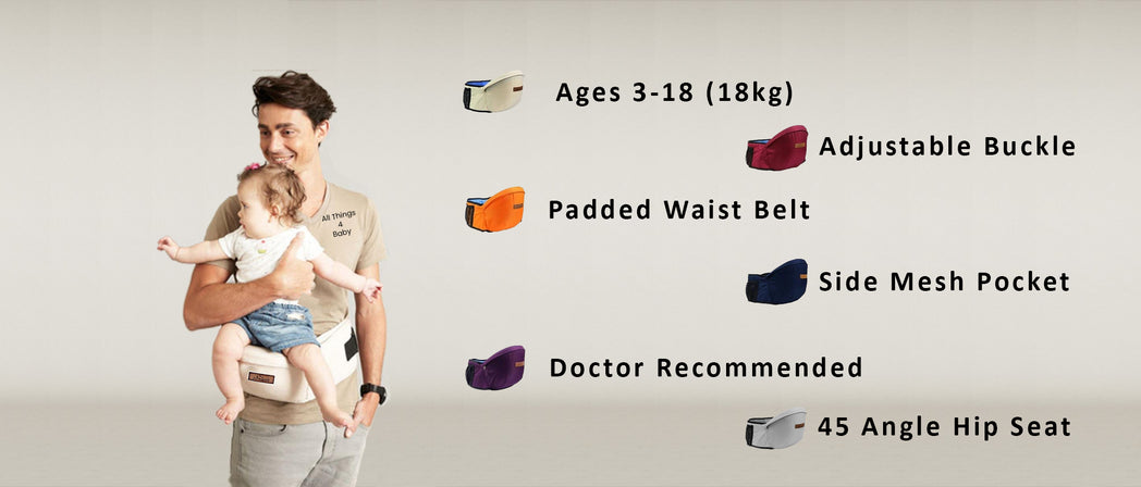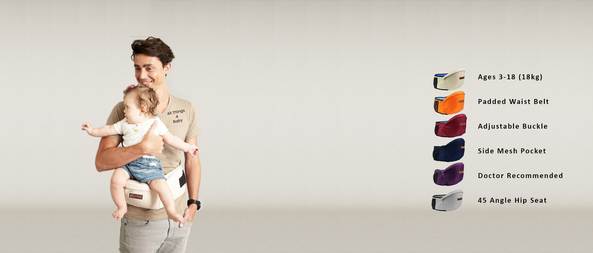 This seat is designed to put your baby's hips in the recommended M-shaped position while taking the strain off of your back, arms, and hips. It's also designed to store items like diapers, wipes, and other essentials inside.